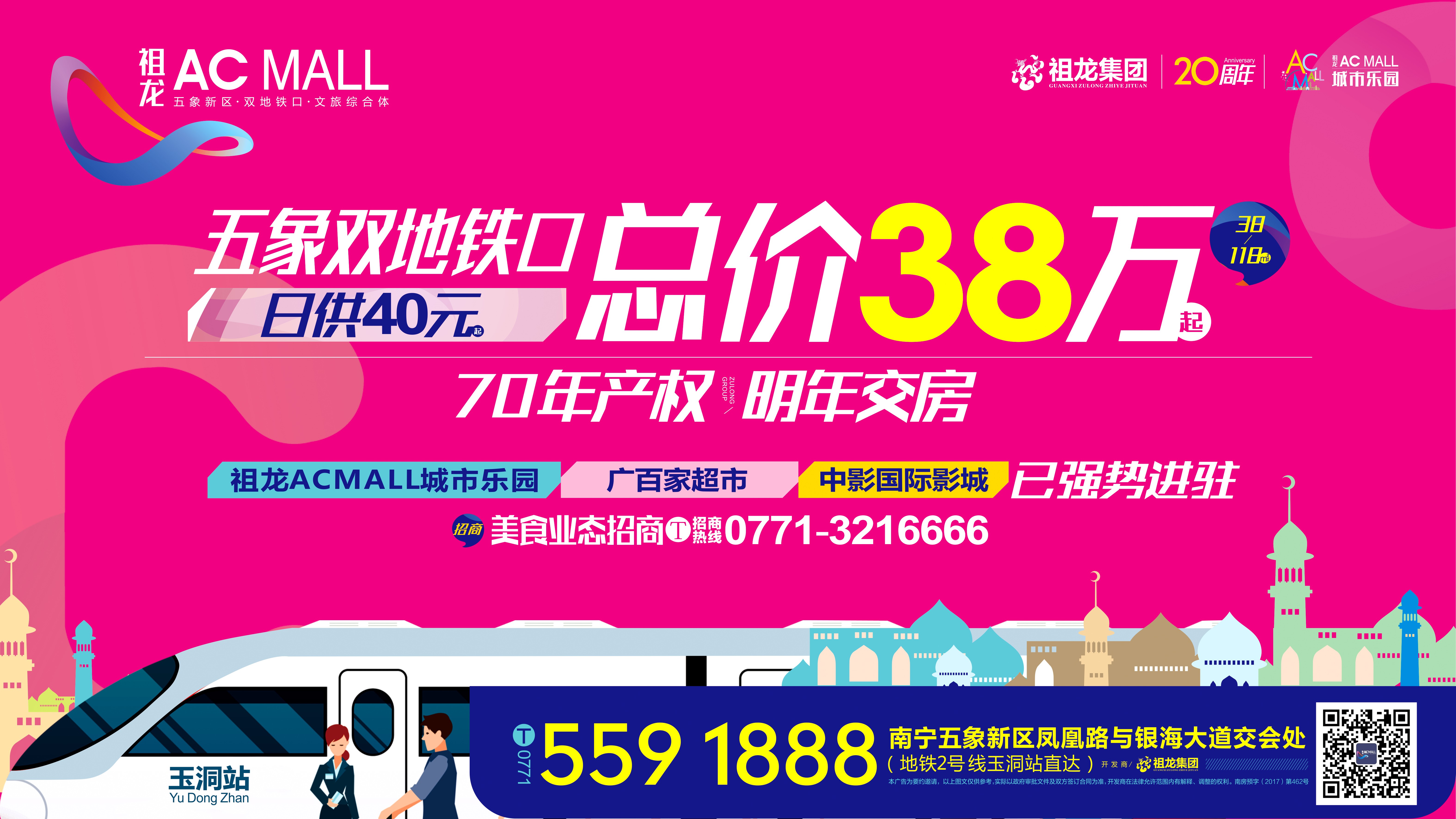 祖龍ACMALL, 雙地鐵上蓋25萬㎡大型文旅綜合體,由星級(jí)酒店、酒店式公寓、高層住宅、城市公寓、加上獨(dú)立的8層文旅商業(yè)MALL組成,商業(yè)MALL即城市文旅綜合體的核心,未來將打造成南寧首家泛家庭城市生態(tài)樂園。由世界級(jí)設(shè)計(jì)團(tuán)隊(duì)堪比迪士尼設(shè)計(jì)團(tuán)隊(duì)精心打造,聚合室內(nèi)主題水世界、溫泉、水療、兒童城、《紅魔坊》美食城堡、美嗨食集、英國(guó)休閑小鎮(zhèn)、文創(chuàng)中心、主題酒店、巨幕影廳、婚慶中心等三十多種業(yè)態(tài)于一體。目前有廣百家超市、中影國(guó)際影城、美嗨集市等知名品牌商強(qiáng)勢(shì)入駐,未來都市繁華一觸即享!